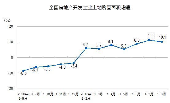 1-8月份,房地產(chǎn)開發(fā)企業(yè)土地購(gòu)置面積14229萬平方米,同比增長(zhǎng)10.1%,增速比1-7月份回落1個(gè)百分點(diǎn);土地成交價(jià)款6609億元,增長(zhǎng)42.7%,增速提高1.7個(gè)百分點(diǎn)。