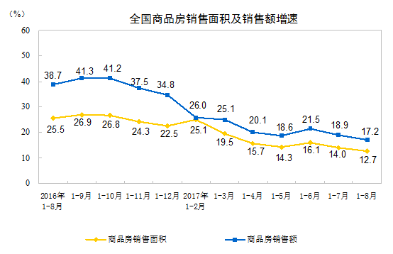 1-8月份,商品房銷(xiāo)售面積98539萬(wàn)平方米,同比增長(zhǎng)12.7%,增速比1-7月份回落1.3個(gè)百分點(diǎn)。其中,住宅銷(xiāo)售面積增長(zhǎng)10.3%,辦公樓銷(xiāo)售面積增長(zhǎng)32.3%,商業(yè)營(yíng)業(yè)用房銷(xiāo)售面積增長(zhǎng)26.9%。商品房銷(xiāo)售額78096億元,增長(zhǎng)17.2%,增速回落1.7個(gè)百分點(diǎn)。其中,住宅銷(xiāo)售額增長(zhǎng)14.2%,辦公樓銷(xiāo)售額增長(zhǎng)26.6%,商業(yè)營(yíng)業(yè)用房銷(xiāo)售額增長(zhǎng)35.4%。