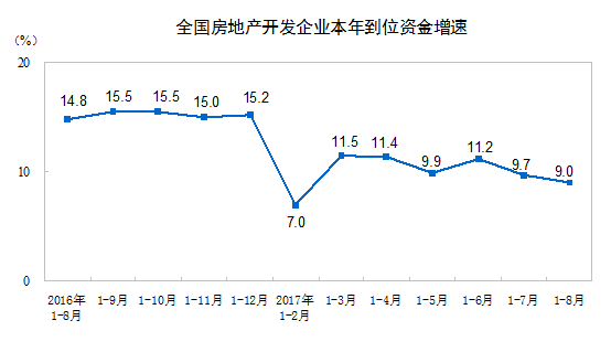 1-8月份,房地產(chǎn)開(kāi)發(fā)企業(yè)到位資金99804億元,同比增長(zhǎng)9.0%,增速比1-7月份回落0.7個(gè)百分點(diǎn)。其中,國(guó)內(nèi)貸款16904億元,增長(zhǎng)19.0%;利用外資112億元,增長(zhǎng)15.4%;自籌資金31439億元,下降1.7%;其他資金51349億元,增長(zhǎng)13.4%。在其他資金中,定金及預(yù)收款30786億元,增長(zhǎng)20.0%;個(gè)人按揭貸款15764億元,增長(zhǎng)2.4%。